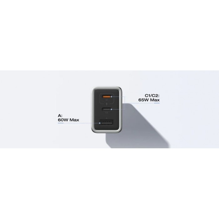 Один выходной порт - USB-C1/C2 до 65 Вт, USB-A до 60 Вт