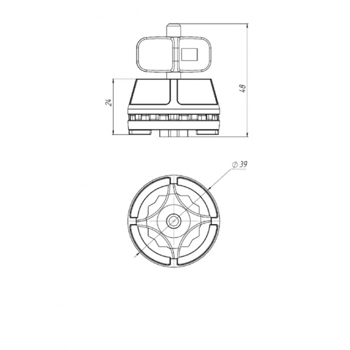 Конструкция состоит из Т-образного болта универсальной формы (высотой 48 мм), торцевой крышки и переходной шайбы Dt027, форма которой позволяет установить конструкцию на профиле с Т-пазом. Адаптер крепится с помощью четырехгранной ручки со вставленной латунной гайкой M6 DIN 934. Основные детали изготовлены из армированного стекловолокном полиамида. Т-образный болт – из нержавеющей стали марки А2.