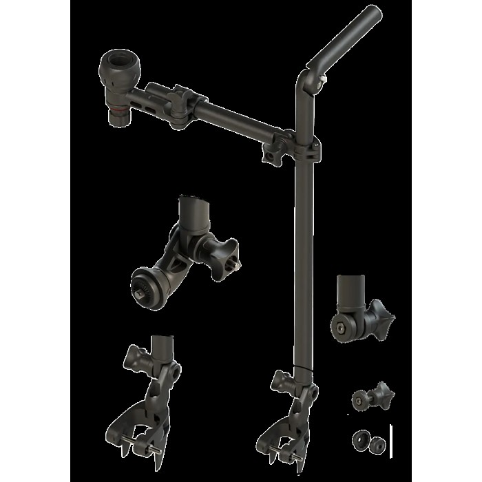 Конструкция состоит из прочного замка для платформы под монитор, труб диаметром 20,4 мм и длиной 170, 400 и 120 мм, соединений, кронштейнов, двухэлементного хомута и адаптера с наружными шлицами. Держатель трансдьюсера снабжен насадками, совместимыми с разными моделями датчиков, включая боковое крепление с полиуретановыми шайбами и поворотными кронштейнами, а также специальный крепеж для датчиков Garmin Panoptix LiveScope.