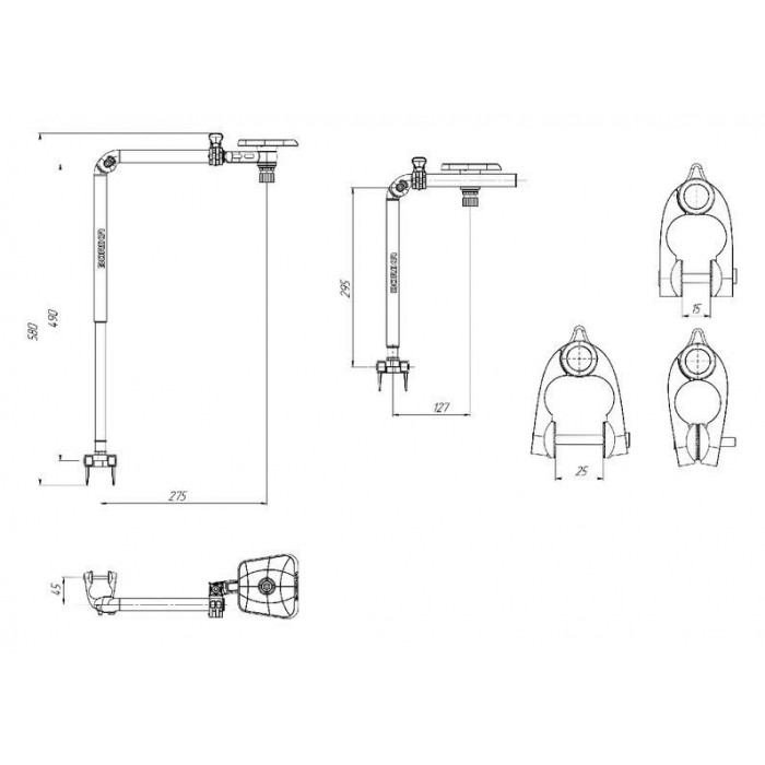 Телескопический держатель для трансдьюсера состоит из нескольких труб с разными длинами (Ø 20,4 мм, L – 170 мм; Ø 20,4 мм, L – 240 мм; Ø 16,2 мм, L – 220 мм), что позволяет устанавливать датчик на глубине от 295 до 490 мм. Держатель имеет двухступенчатую конструкцию с фиксирующей системой, срабатывающей автоматически при разложении труб. Чтобы сложить держатель, достаточно нажать кнопку на соединении труб. В конструкции предусмотрены два поворотных кронштейна и радиусные шайбы, позволяющие регулировать ширину охвата и обеспечивающие надёжное крепление датчика.