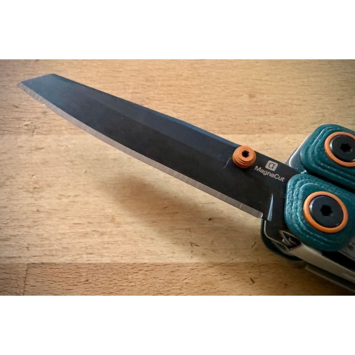 Главное обновление модели — лезвие из порошковой стали CPM MagnaCut. Этот сплав сочетает высокую твёрдость, стойкость к износу и отличную коррозионную защиту. Форма «обратное танто» с плоской саблевидной заточкой обеспечивает точный контроль и лёгкость реза.