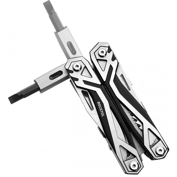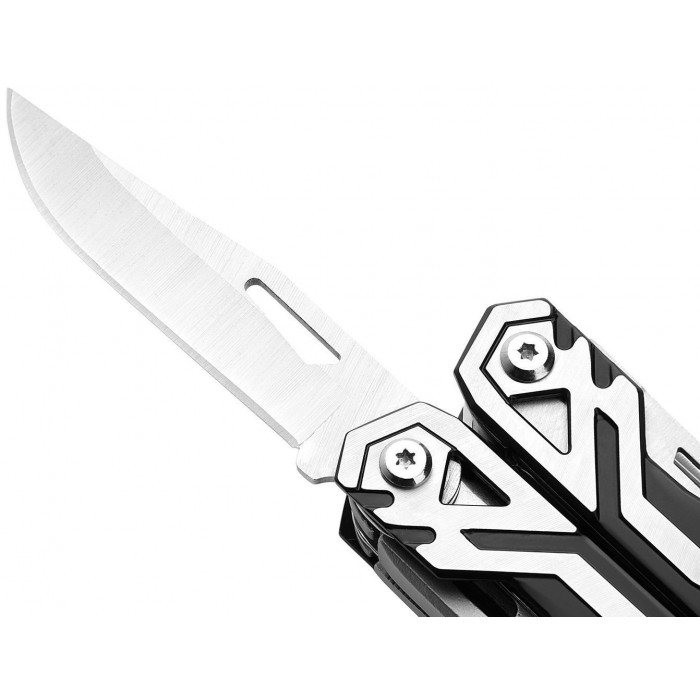 Мультитул предлагает 21 функцию, среди которых острогубцы, плоскогубцы, кусачки, плоский нож, отвертка с магнитным держателем на 8 насадок, линейка/напильник, серрейторный нож, консервный нож, открывалка для бутылок, шило, мини-отвертка и многое другое. Каждый элемент имеет защиту от случайного срабатывания, что обеспечивает безопасность при использовании. Этот набор инструментов делает мультитул идеальным помощником для выполнения множества задач — от ремонта до приключений на природе. Вот перечень опций инструментов, включенных в этот мультитул: